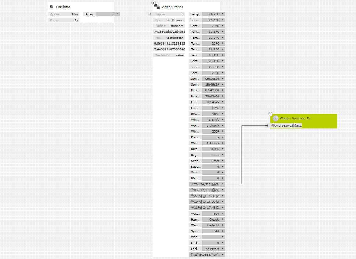 Das Beispiel zeigt die Anwendung des Bausteins zur einfachen, kompakten Wetter-Visualisierung. Der Baustein wird durch den Oszillator alle 10 Minuten aktiv gesetzt, um die Daten abzufragen und zu aktualisieren.